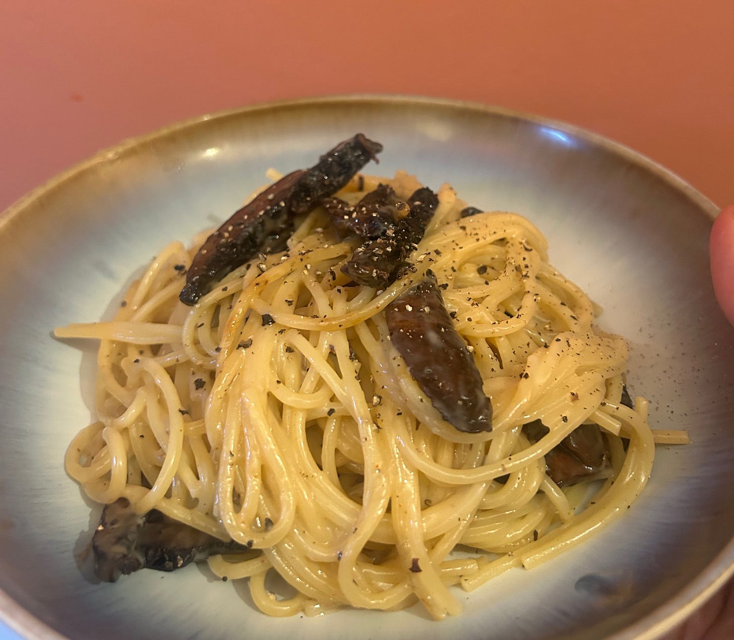 I made one of my favourite recipes recently, which is a mushroom carbonara. The trick is always to remember that it’s really hard to fuck up a mushroom, and so you want to go hard on it to get it dry and crispy, imitating the fatty richness of the traditional guanciale omitted from this recipe.